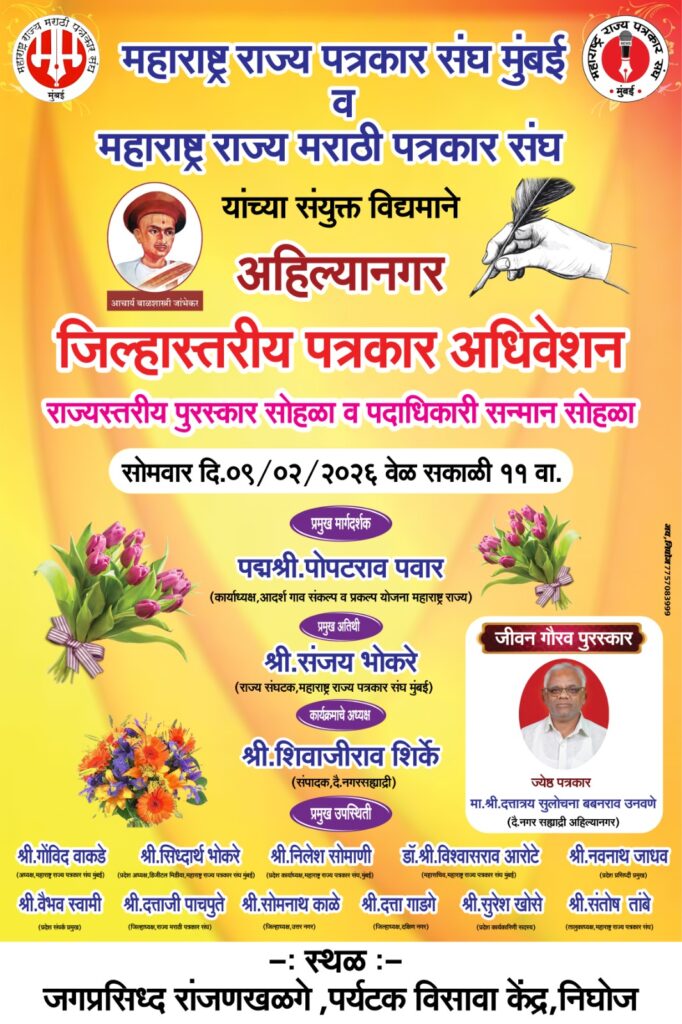 निघोज तालुका पारनेर येथील दैनिक सह्याद्री वृत्तपत्राचे पत्रकार व नियमित सामाजिक पत्रकारित क्षेत्रात मोठा अनुभव असलेले माझे वर्गमित्र श्री दत्ताजी उनवणेयांना महाराष्ट्र राज्य मराठी पत्रकार संघ मुंबई यांनी जीवनगौरव पुरस्कार सन्मानित केले असून हा सोहळा जिल्हास्तरीय पत्रकार अधिवेशन सोमवार दिनांक नऊ दोन 26 रोजी सकाळी 11 वाजता कुंड पर्यटन क्षेत्र विसावा हाल येते पद्मश्री पोपटरावजी पवार साहेब श्री संजय भोकरे साहेब श्री शिवाजीराव शिर्के साहेब तसेच अनेक मान्यवरांच्या उपस्थितीत हा पुरस्कार प्रदान करण्यात येणार आहे त्यांना मिळाल्या जाणाऱ्या या पुरस्काराने सर्वत्र कौतुक होत असून त्यांच्या भावी आयुष्यात अशीच भरभराटी होऊ अशी सदिच्छा व्यक्त करण्यात येत आहे श्री मळगंगा ग्रामीण विकास ट्रस्ट प्रसिद्धीप्रमुख श्री मुकुंद रामचंद्र निघोज कर यांनी पत्रकार द्वारे ही माहिती दिली आहे