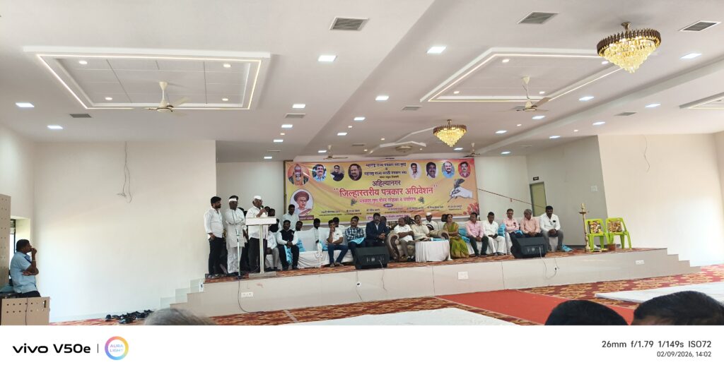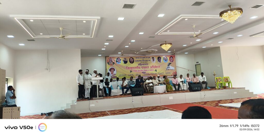 सविस्तर वृत्त असे की महाराष्ट्र राज्य पत्रकार संघ मुंबई व महाराष्ट्र राज्य मराठी पत्रकार संघ यांच्या संयुक्त विद्यमाने अहिल्यानगर जिल्हास्तरीय पत्रकार अधिवेशन सोमवार दिनांक 9 फेब्रुवारी 2025 रोजी सकाळी अकरा वाजता मोठ्या संख्येने पत्रकार बांधव तसेच पद्मश्री पोपटरावजी पवार साहेब श्री शिवाजीराव शिर्के साहेब तसेच महाराष्ट्र राज्य पत्रकार संघाचे सचिव श्री विश्वासरावजी आरोटे सर व या कार्यक्रमाला आवर्जून उपस्थित असलेले श्री मळगंगा ग्रामीण विकास ट्रस्टचे कार्याध्यक्ष श्री वसंतराव जी बाबासाहेब कवाद तसेच उपाध्यक्ष श्री अमृता शेठ रसाळ साहेब शिवसेना जिल्हाध्यक्ष माननीय डॉक्टर शिरोळे निघोज येथील कार्यकर्ते प्रामुख्याने माजी सरपंच टकाराम जी लंके कन्हैया उद्योग समूहाचे सर्वोच्च युवा नेते मच्छिंद्र शेठ लंके साहेब राष्ट्रवादी काँग्रेस नेते श्री सोमनाथ जी वरखडे साहेब तसेच इतर मान्यवर यांच्या उपस्थितीत तसेच जिल्ह्यातील सर्व पत्रकार बांधव यांच्या उपस्थितीत अतिशय थाटामाटात साजरा झाला यावेळी जेष्ठ पत्रकार व गेली 40 वर्षे पत्रकारितेत काम करणारे निगोजेतील श्री दत्ताजी सोनवणे साहेब यांना जीवन गौरव पुरस्कार प्रदान करण्यात आला तसेच कन्हैया उद्योग समूहामार्फत पत्रकार शेरकर साहेब व चौधरी साहेब यांना पुरस्कार प्रदान करण्यात आला यावेळी सूत्रसंचालन शिवव्याख्याते श्री कवादसाहेब यांनी केले व आभार प्रदर्शन श्री भास्कर रावजी कवादयांनी केले