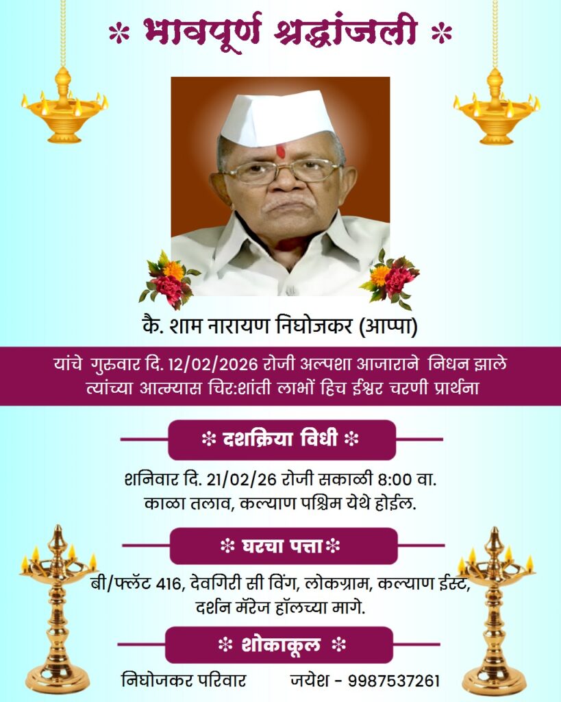 निघोज तालुका पारनेर जिल्हा अहिल्यानगर येथील ज्येष्ठ पत्रकार श्री मुकुंद रामचंद्र निघोज कर यांचे चुलते कैलासवासी शामराव नारायण निघोज कर यांचे नुकतेच वृद्धापकाळाने वयाच्या 92 व्या वर्षी निधन झाले अतिशय शांत संयमी असेही व्यक्तिमत्व असून अनेक सामाजिक धार्मिक संस्थेमध्ये त्यांचा नेहमी सहभाग आहे एकंदरीत चार भावांचे कुटुंब असलेले शामराव हे प्रमुख होते त्यांनी अतिशय बिकट परिस्थितीत मुंबईला जाऊन चारही भावांना योग्य अशा पद्धतीने मार्गदर्शन करून नोकरीला लावले व स्वतःही टेक्निकल बोर्ड ऑफिसर म्हणून काम केलेअतिशय निस्वार्थ अशी व्यक्ती म्हणून यांच्याकडे पाहिले जात होते त्यांचा दशक्रिया विधी काळा तलाव कल्याण येथे 21 फेब्रुवारी 2026रोजी होणार आहे त्यांच्या जाण्याने परिसरात शोक व्यक्त करण्यात येत आहे अशी माहिती त्यांची चिरंजीव जीवन शामराव निघोज कर यांनी दिली आपण हे सर्व या कार्यक्रमाला उपस्थित राहून श्रद्धांजली वाहावी असे आव्हान त्यांनी केले आहे