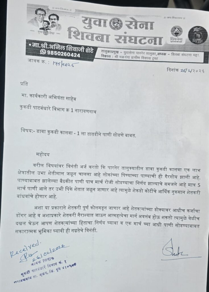 सविस्तर वृत्त असे की कुकडी डावा कालवा यामधून एक मार्च रोजी पाणी आवर्तन सोडावे अशी मागणी तील शेतकरी तसेच माजी सरपंच ठकाराम लंके साहेब व शिवसेना व शिवबा संघटनेतील कार्यकर्ते तसेच अध्यक्ष अनिल शेटे यांनी पत्राद्वारे केली आहे सध्या तातडीने पिकांना पाण्याची गरज असल्याने त्वरित आवर्तन सोडावी अशी मागणी त्यांनी या पत्रकार द्वारे केली आहे काही भागात पिण्याचे पाणी सध्या तुटवडा भासत आहे व उभे जळून जाण्याची शक्यता असल्यामुळे त्वरित आवर्तन सोडावी अशी मागणी कार्यकारी अभियंता पाटबंधारे विभाग नारायणगाव यांच्याकडे केली आहे अशी माहिती ज्येष्ठ पत्रकार मुकुंद निघोजकर यांनी दिली आहे