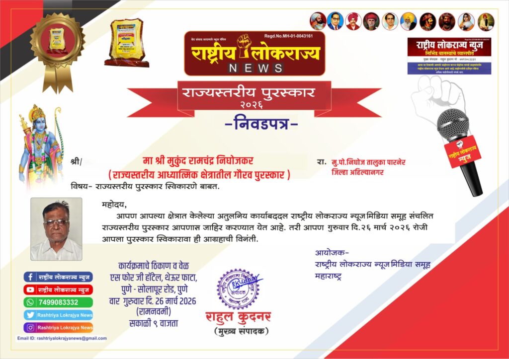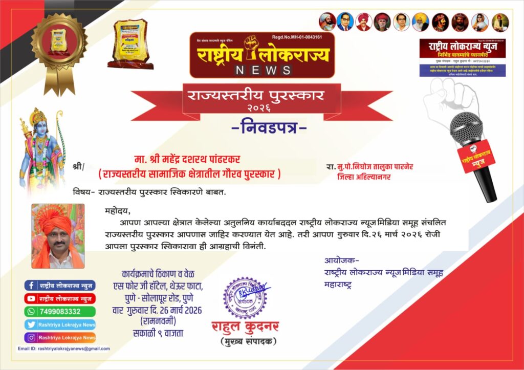 यावर्षी 2026 रोजी चे राष्ट्रीय लोकराज्य राज्यस्तरीय पुरस्कार चार जणांना जाहीर झाली हा पुरस्कार सोहळा 26 मार्च रोजी पुणे येथे होणार आहे डॉक्टर सुवर्णाताई लोळगे पारनेर यांना वैद्यकीय क्षेत्रातला पुरस्कार बोरा शिरूर यांना आदर्श एडवोकेट पुरस्कार तसेच मुकुंद निघोजकर यांना राष्ट्रीय आध्यात्मिक क्षेत्रातील गौरव पुरस्कार तसेच सामाजिक राजकीय कार्यकर्ते श्री महेंद्र पांढरकर यांना सामाजिक क्षेत्रातील गौरव पुरस्कार जाहीर झाले असून या पुरस्काराचे वितरण पुणे येथे 26 मार्च रोजी होणार आहे सदर पुरस्काराबाबत सर्वांचे अभिनंदन करण्यात येत आहे त्यांच्या भावी कार्यास अनेक जणांनी शुभेच्छा दिल्या त्यांचे त्या त्या क्षेत्रातील कर्तृत्व पाहून हा पुरस्कार राष्ट्रीय लोकराज्य पत्रकारिते मार्फत देण्यात आला आहे या पुरस्काराला खूप महत्त्व असून राष्ट्रीय व राज्यस्तरीय पुरस्कार असल्यामुळे निश्चितच याला अनन्य असे महत्व प्राप्तझाले आहे ही माहिती ज्येष्ठ पत्रकार मुकुंद निघोजकर यांनी पत्रकार द्वारे दिली