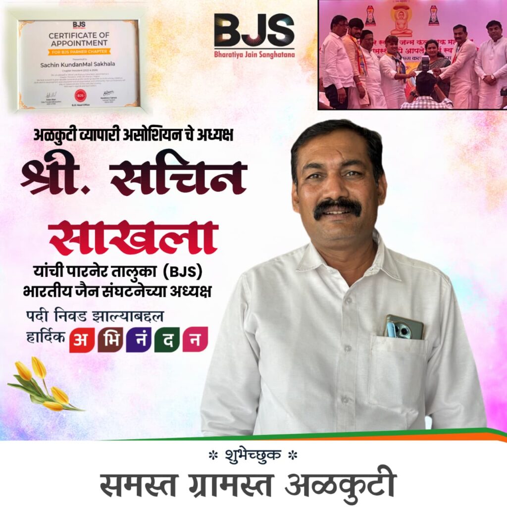 *पारनेर तालुका प्रतिनिधी श्री रामदास नरड यांच्याकडून सविस्तर वृत्त असे की आळकुटी येथील प्रसिद्ध समाजसेवक जैन समाजाचे वरिष्ठ माजी पंचायत समिती सदस्य पारनेर यांचे चिरंजीव श्री सचिन साखला यांची पारनेर तालुका जैन संघटनेचे अध्यक्षपदी बिनविरोध निवड झाली त्याबद्दल त्यांचे पारनेर तालुक्यातून अभिनंदन होत आहे सचिन साख ला हे उद्योजकापासून आळकुटी वेल्फेअर व्यापारी असोसिएशनचे अध्यक्ष आहेत त्यांचे सामाजिक काम मोठे असून जैन संघटनेने नुकतीच त्यांच्याकडे अध्यक्ष पदाची जबाबदारी दिल्यामुळे जैन समाजात त्यांचे कौतुक होत आहे