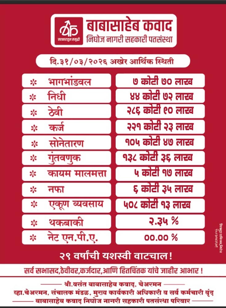 *निघोज येथील स्वर्गीय बाबासाहेब यांनी चालू केलेली पतसंस्था अतिशय नावारूपाला असून या संस्थेने 29 वर्षाची परंपरा कायम राखली असून संस्थेला 2026 रोजी 31 मार्च रोजी एकूण नफा 6 कोटी 35 लाख झाला असून संस्थेने सोनेतारण कर्ज 105 कोटी 47 लाख रुपये वाटले आहे सर्वात जास्त सोनेतारण कर्ज सुरक्षितच्या दृष्टीने दिल्या असून संस्थेचे व्याजदर अतिशय कमी असल्यामुळे लोक आकर्षित झाले आहे लोकांच्या विश्वासामुळे संस्थेची प्रगती दिवसेंदिवस होत आहे संस्थेचे अध्यक्ष स्वर्गीयबाबासाहेब कवादयांचे चिरंजीव श्री वसंतरावजी कवादसांभाळत आहे संचालक मंडळाच्या पारदर्शक कारभारामुळे तसेच वसुली व कर्ज वितरण अतिशय लक्षपूर्वक केले जाते त्यामुळे या संस्थेकडे पाहण्याचा दृष्टिकोन एक विश्वासू पतसंस्था म्हणून पाहिले जाते या संस्थेच्या एकूण ठेवी 286 कोटी दहा लाख असून कर्ज वाटप 221 कोटी 23 लाख आहे संस्थेची गुंतवणूक 138 कोटी 36 लाख रुपये आहे अतिशय भक्कम अशी स्थितीअसल्यामुळे संस्थेकडे लोकांचा ठेवण्याकडे कल आहे अशाच प्रकारे दिवसेंदिवस संचालक मंडळाने संस्थेला उज्वल अशी स्थिती प्राप्त करून द्यावी व अशाच प्रकारे कार्य चालू ठेवावे अशी सभासदाकडून मागणी होत आहे संस्थेचे मॅनेजर श्री सावकार लंके साहेब यांनी सोबतच्या पत्रकार द्वारे ही माहिती दिली आहेत्यांचे आर्थिक पत्रके पाहून लोकांनी अभिनंदन केले आहे ही माहिती ज्येष्ठ पत्रकार मुकुंद निघोजकर यांनी पत्रकार द्वारे दिली आहे